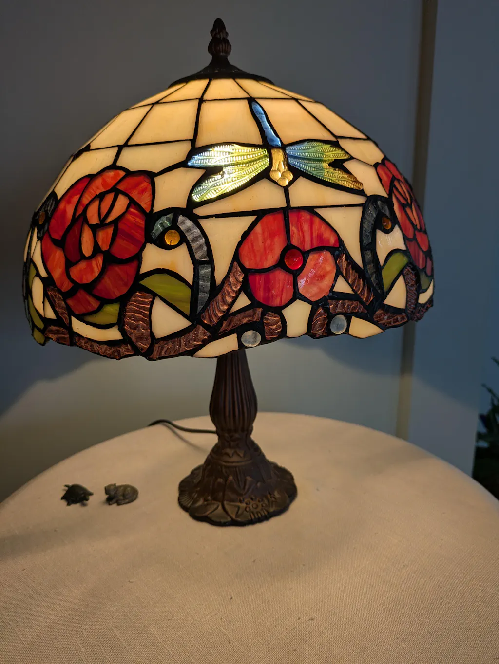 When turned off, the tones appear deeper and more subdued. This beautiful transformation is one of the defining characteristics of authentic Tiffany-style lamps.